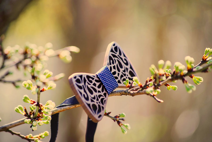 Uni habillé d’un tissu en son centre, ajouré, ouvert, gravé : le noeud papillon en bois> peut se permettre toutes les fantaisies et répond aux envies de chacun. Le choix de cette matière, très marqué ces dernières années, va avec la naissance de la conscience écologique et dénote une volonté de retour aux sources, un profond besoin de nature. Les mariés optent de plus en plus pour une ambiance champêtre, bohème. Ici, le nœud papillon en bois a évidemment toute sa place.